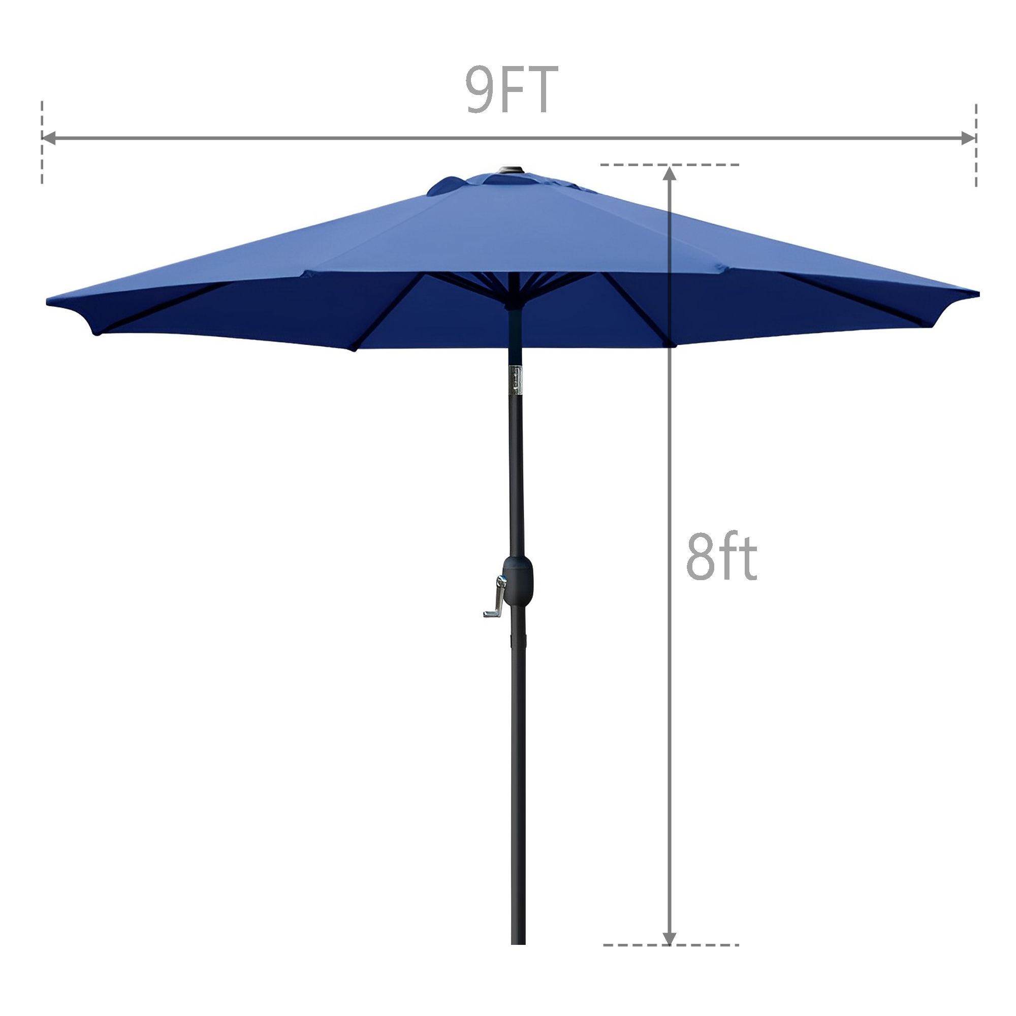 Efficient Shade Solution: Providing around 63 square feet of coverage, this umbrella is perfect for pairing with 42 to 52-inch outdoor tables, offering comfortable shade for 2-4 people.Sturdy Build: Constructed from durable aluminum and steel, powder-coated for longevity, and featuring 8 robust ribs for added support and stability.User-Friendly: Equipped with a smooth crank lift for effortless opening and closing, with an adjustable angle for personalized Sun-following relaxation.UV Protection and Waterproof: Utilizing 200G premium polyester fabric, this umbrella offers UPF 50+ for 98% UV blockage, along with a PA coating for waterproof durability.Versatile Placement: Suitable for various outdoor settings, complementing a range of outdoor decor and furniture styles.Base Not IncludedNote: To extend the umbrella's lifespan, it's recommended to securely tie it when not in use, especially during windy or rainy conditions.Easy Setup: Installs quickly without the need for tools, providing shade with convenience.