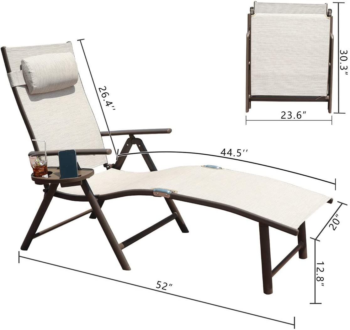 Adjustable reclinning lounge chair : By lifting the armrests on both sides, you can adjust the back of the recliner to seven different angles. The footrest can also be put down or raised up according to your needs.Durable Aluminum Frame: Featuring heavy-duty aluminum frame, the chaise lounge chair is able to withstand heavy weight which is up to 350 lbs. Moreover, the selected aluminum material not only makes the recliner lighter than others, but also resists well to rust and deformation.
