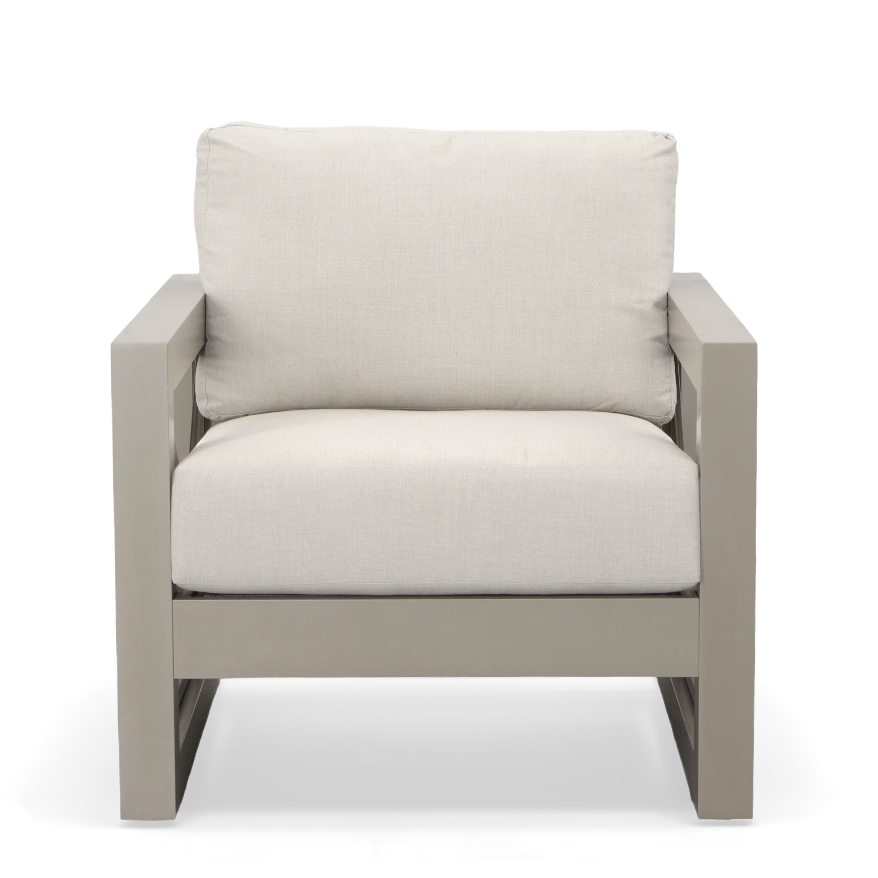 DimensionsCarton Dimensions L 35.8 x W 26.8 x H 20Features-Rust and heat resistant aluminum frame with hand brushed woodgrain finish and a sparkle frame coating-Aluminum frame is light weight and sturdy, easy to move around, and more durable than steel items which are heavy and more likely to rust than aluminum-2000 hours UV treated, solution-dyed acrylic fabric is fade and stain resistant-Extra thick 7.25-inch seat cushion makes for an exceptionally comfortable seat-3.0 density foam makes for more comfortable and durable seating with resistance to form and comfort loss common in the 2.0-2.5 density foam found in many outdoor seatsProduct DescriptionTransform your patio into a captivating showcase of neutral contemporary style with our Outdoor Arm Chair. Designed to withstand the elements, this chair combines durability with exceptional aesthetics. The beveled end panels frame a modern geometric pattern, giving it a sculpted look that is perfect for outdoor settings. Crafted with rust-resistant aluminum frames, solution-dyed acrylics, and fast-drying foam cushions, this chair offers both comfort and longevity. Embrace the best of both worlds – the appearance of indoor upholstery with the durability of outdoor furniture.